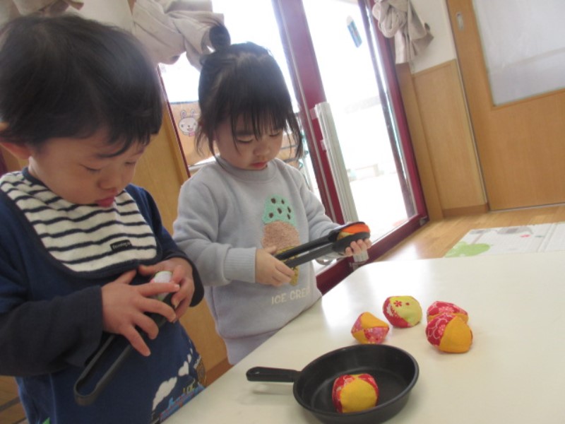 今日は、ごっこ遊びを楽しみました。 片手にお買い物バッグ、もう片方の手には手作りスマートフォンを持ちお買い物を楽しんでいました。 スマートフォンを耳に当て「ママ早く来てね」「いっぱい買ったよ」とお喋りを楽しんでいました。