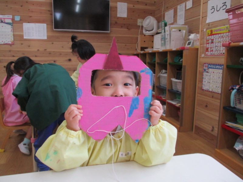 前回の製作に引き続き、鬼のお面作りをしました。 紙ストロー・毛糸・リボン等、沢山の素材を自由に使い、創作する楽しさを感じる事が出来ました。 「可愛い鬼にする!」「怖い鬼にする!」と盛り上がっていたうさぎ組です!