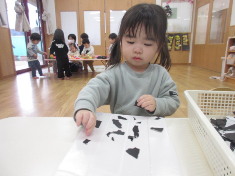 少しずつ自分の力で縦に上手に千切れる様になり、厚紙に一枚貼っては「先生できたよ」と嬉しそうに見せてくれました。