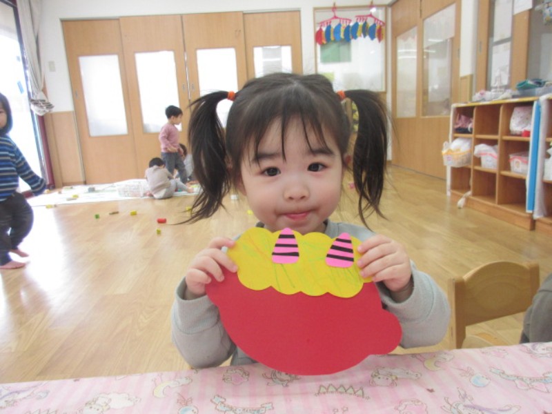 今日の製作では、鬼の顔に”髪の毛””角”を貼り付けました。