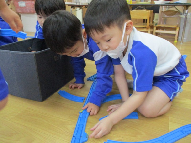 久しぶりにプラレールで遊びました。 「ここに線路を繋げよう。」「ここは、長い道にしよう。」と お友達と相談しながら、取り組む姿が沢山見られました。 途中、積み木で「トンネルを作ろう!!」と言う声も 聞かれたりとアイデアが次々と出ていましたよ!!