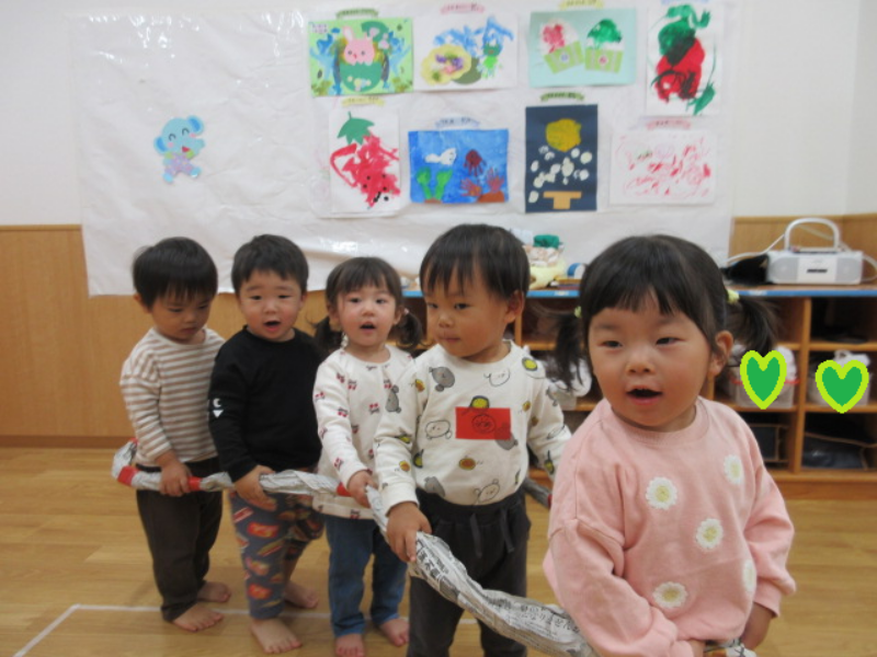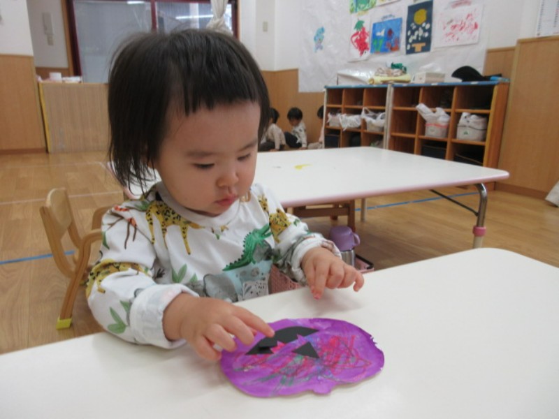 ハロウィン製作のジャック・オ・ランタンの目と口を貼ると 「かぼちゃお化け~」とお友達と見せ合い楽しむ姿がありました。 そして製作の後は新聞遊びをして、「お昼寝ごっこ」や「電車ごっこ」を したりして室内でも元気一杯に過ごしましたよ!