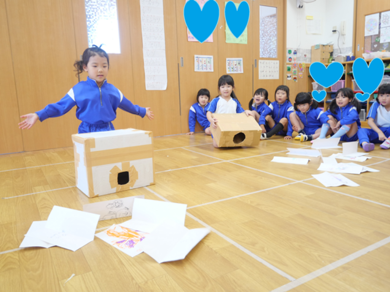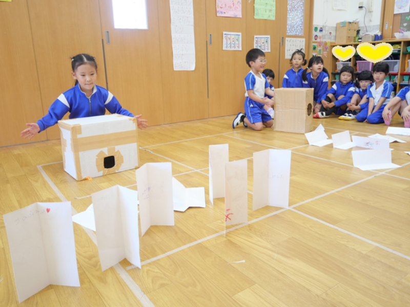 今日は、実験遊びをしました。 今回のテーマは空気です。 目に見えない空気が空気砲を使う事で風になり身体で感じました。 また、自分達で作った的を倒して遊びました。 大きさの違う段ボール空気砲を見て、どの空気砲が強いのか予想も しました。 点数を競って大盛り上がりでしたよ。
