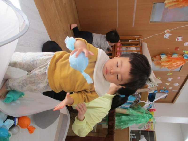 もうすぐハロウィンですね! と言う事で、花紙でボールを包み、キャンディーに見立てで遊びました。 興味津々に触り、花紙を破いたり、千切ったりと中のボールを出そうと する子ども達でしたよ。 ボールが出てくると、保育者に見せて出てきた事をしっかりとアピール していました。