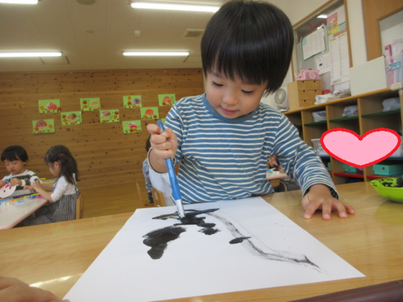ハロウィン製作をしました。 筆を使って丸や線を描き、ゴーストの顔を描く事に チャレンジしました。 筆で描く楽しさを味わい丸や線だけでなく、点々を 表現したりと筆のタッチを不思議そうに筆先を見て 取り組む姿がありました。