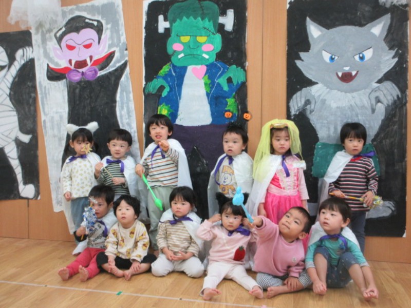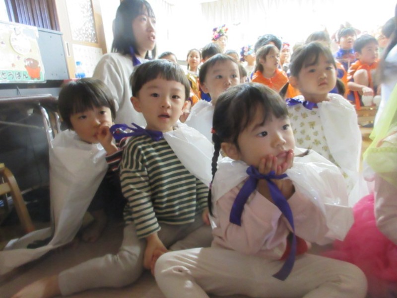 今日はハロウィン会に参加しました。 先日作った、お化けマントを身に付け、子ども達に 「可愛い」と声が沢山届きました。 「何のお化けが通ったかな」クイズでは、「あー!!」 「おおかみ(男)」「ワオーン」等声に出す姿が見られました。