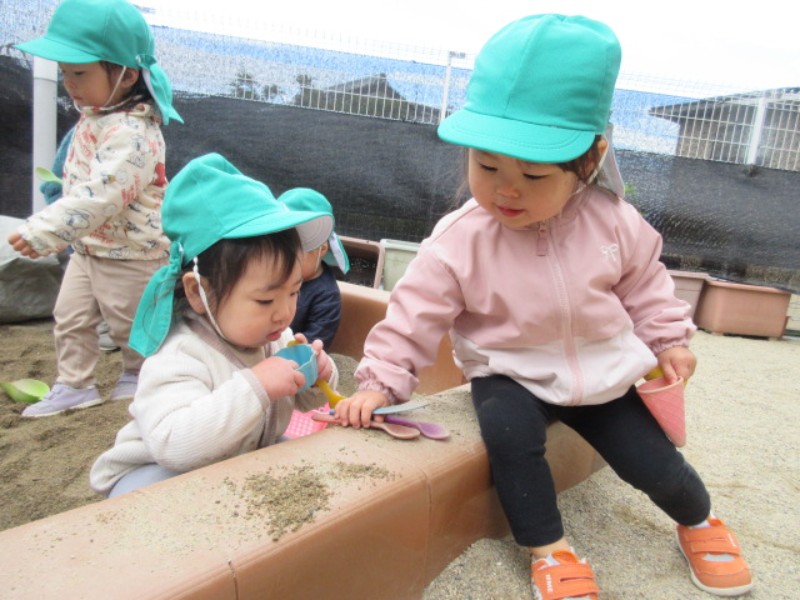 「今日もお外行こう」と伝えると、朝のおやつを食べている時から 「何して遊ぼう」とワクワクしている子ども達は園庭に出ると 好きな場所へ一目散に走り出していました。 「○○はいりますか?」と店員さんになり切ったり、遊具から 素敵な笑顔を覗かせたり、楽しそうなやり取りが沢山聞かれました。