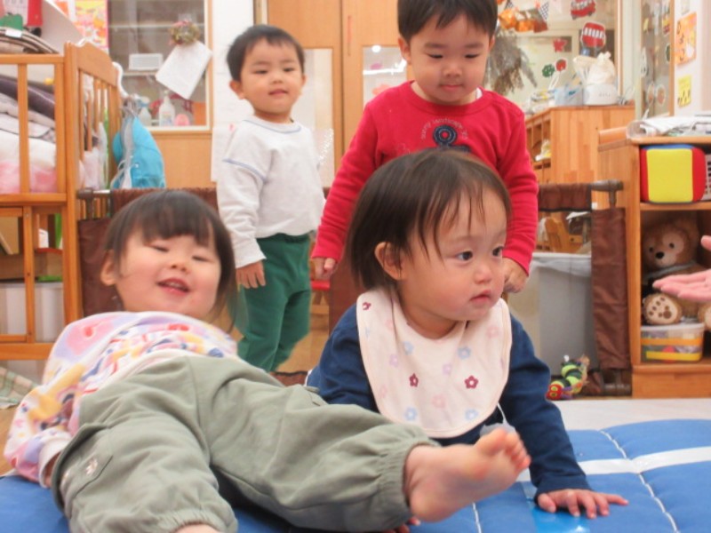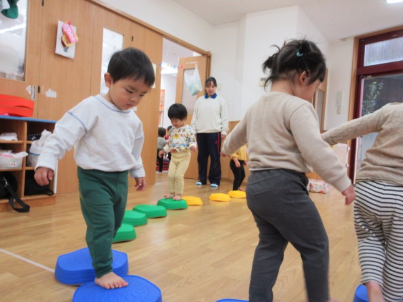 ひよこ組、あひる組合同でサーキット遊びをしました。 ミニハードル、バランスストーン、マットの山登りに挑戦し「出来たよ」と 満面な笑みで伝える子ども達でした。 いつもより沢山のお友達がいて、賑やかな雰囲気の中、身体を動かす事を 楽しみました。