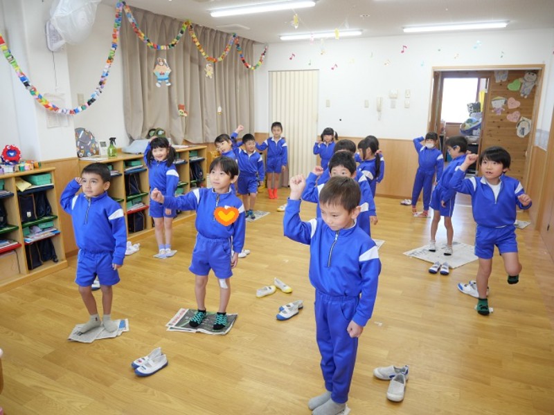 今日は、新聞ジャンケンをしました。 以前5‐5交流で経験した事もあり、「負けたら新聞小さくするよ!」と しっかりとルールを覚えていて取り組んでいました。 新聞が小さくなると落ちない様にバランスを取りながら、ジャンケンを する姿が可愛らしかったです。