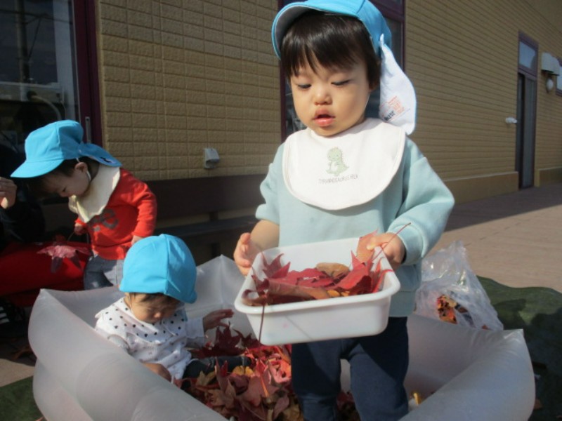 今日はテラスで落ち葉遊びをしました。 落ち葉のプールを作ってみると、そーっと中に入り、落ち葉に囲まれて 嬉しそうにする姿が見られましたよ。 保育者と一緒に入れ物に集めたり、パラパラと散らして落ち葉の感触を 楽しみました。