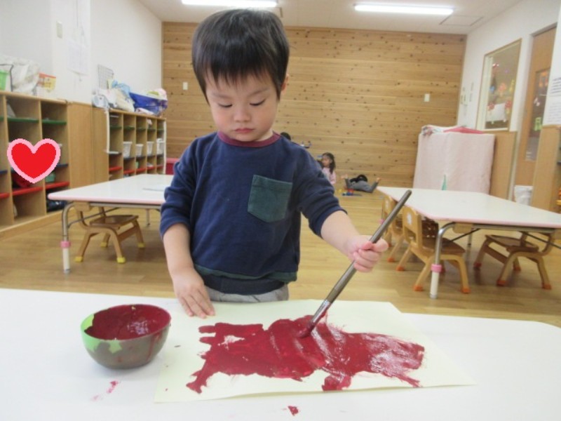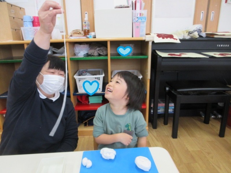 今日は、筆を使って「さつま芋」を描きました。 画用紙いっぱいに大きくグルグルと描いたり、2個、3個と繋げて 1つの大きな芋を描いたりと表現する事を楽しんでいましたよ。 その後の粘土遊びでは、細長く伸ばして保育者がユラユラ揺らすと 掴もうとしたり、丸めた粘土を繋げてお花を作ったりと、思い思いに 楽しんでいた子ども達です。