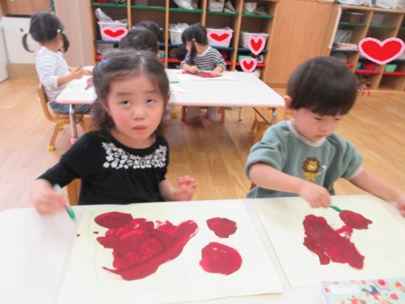 今日は、さつま芋製作の続きをしました。 緑色のクレパスで蔓を描き、葉っぱを貼りました。 お芋の周りをグルグルと描く姿もあれば、お芋の中に描く姿も あったりと楽しんで取り組む子ども達でした。 また、エントランスにも飾るので楽しみにしていてくださいね。