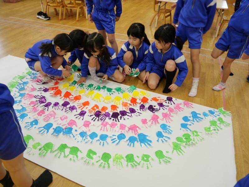 協同作品で「虹と自画像」を製作しました。 以前取った手型を並べて虹を作る時に、子ども達同士で話し合いながら それぞれの配置を決める等協力して、取り組む姿が見られました。 そして、今日描いた自画像は、虹の周りに貼り付ける予定です。 どんな仕上がりになるのか楽しみにしている子ども達です。