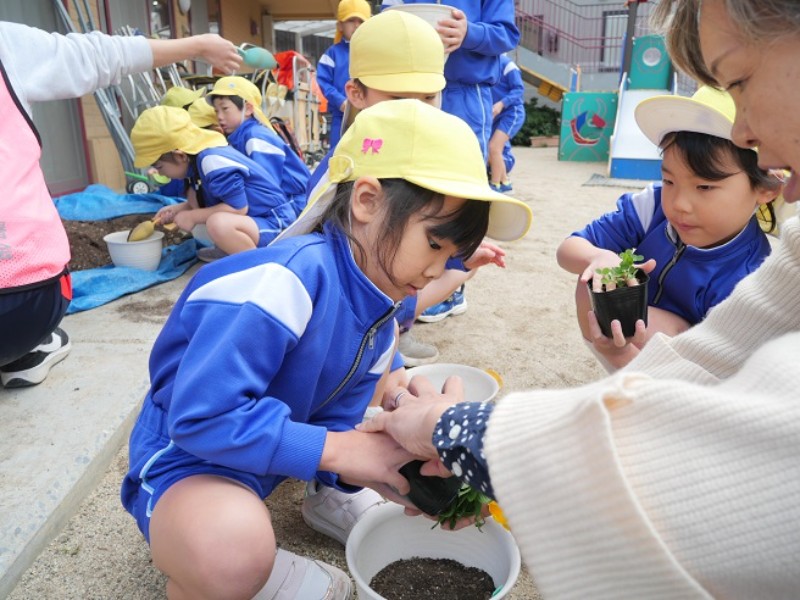 一里山公園にあるお花屋さんへ一人一つ好きなお花を選びに行きました。 初めて見るお花の名前があると「これはどんな色のお花?」等、沢山の質問を して興味を示す子ども達でした。 今日購入したお花は、卒園式まで大切に育てていきます。
