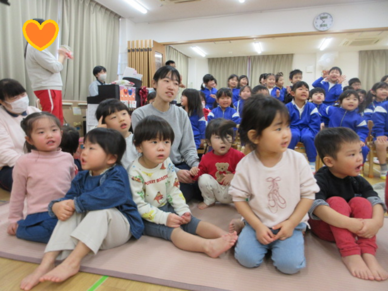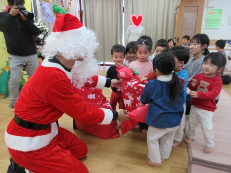 今日は、12月のお誕生日会とクリスマスに参加しました。 「あれ、何か鈴の音が聞こえるね」と保育者が声を掛けると 手を耳に当てて聞こうとする姿が見られ、サンタさんと一緒に 「ジングルベル」や「赤鼻のトナカイ」を歌ったりと楽しんで 参加する事が出来ました。 サンタさんからのプレゼントを頂きとても嬉しそうにしていた 子ども達は、お部屋に戻ってからもプレゼントが気になり興奮が 抑えきれない様子の子ども達でした。