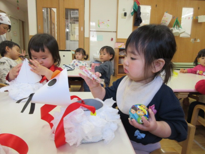 今日は、楽しみにしていた特別な日でしたがサンタさんの 登場に驚いたり、「怖くない?」と見つめたり手を叩いて 喜ぶ姿等、様々な表情を見せていた子ども達は、素敵な プレゼントに目を輝かせていました。 自分で作ったプレゼントBOXを何度も開けては、プレゼントも 見つめていましたよ!