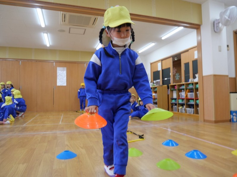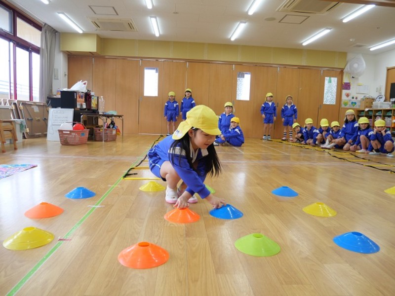 今日は、新しい運動遊びをしました。 バラバラになったコーンを色ごとに元の場所に配置していくと いう頭と身体を同時に使ったゲームです。 一人一回ずつ動かしていき、先に元通りに出来たチームの勝利と いうルールで少し難しいかと思いましたが、お友達と声を掛け合い 協力プレイを見せてくれましたよ。