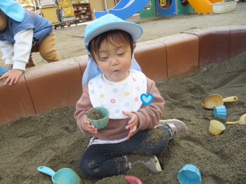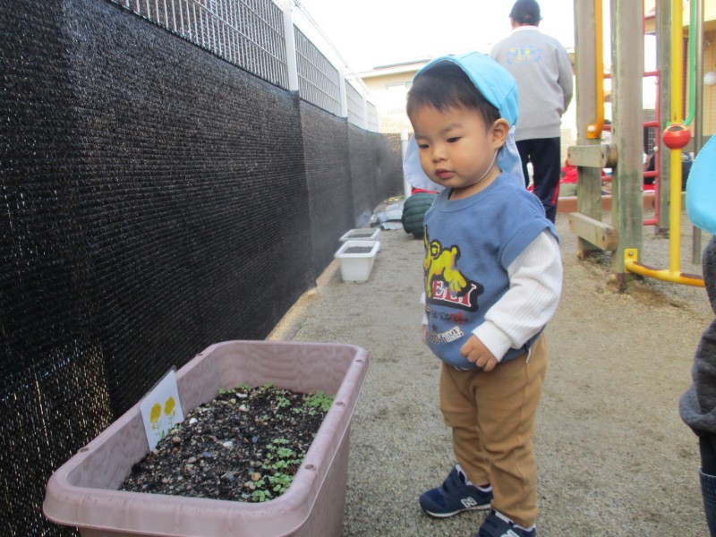 園庭で遊びました。 冬空の下、伸び伸びと身体を動かし、好きな遊びを 見付ける子ども達でした。 「小石があったよ」「プランターの野菜の芽が出ているね」と 発見した事を保育者に伝えようとする姿も見られましたよ。