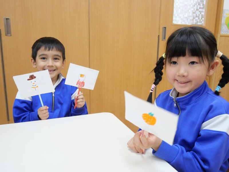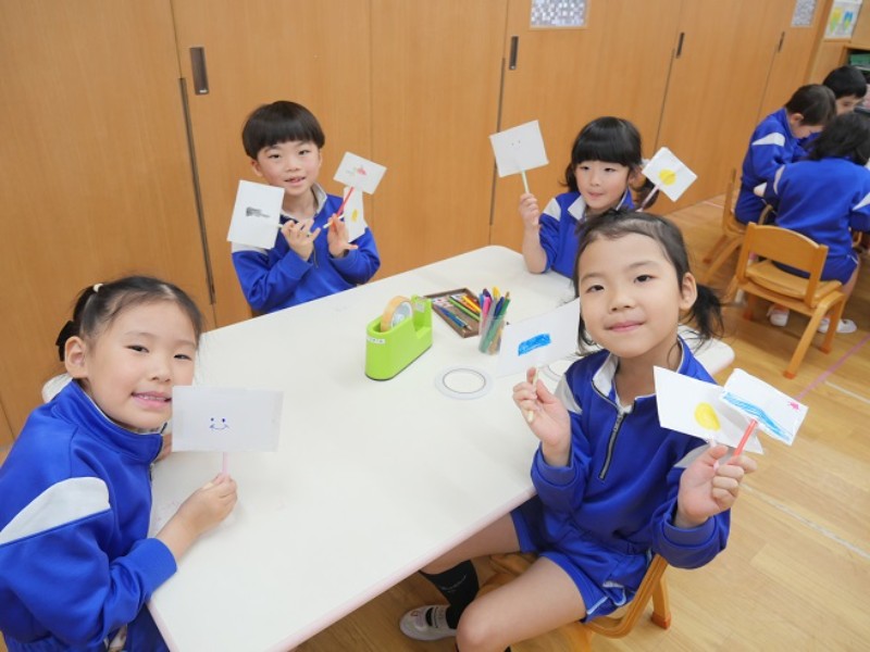 今日は、「ソーマトロープ」という実験玩具作りをしました。 2枚の絵を重ねて回転させると、1枚の絵に見える不思議な 玩具です。 皆それぞれ重なった時にどのように見えるのか、想像力を動かせ ながら作りました。 出来た物をお友達と見せ合いっこして楽しみましたよ。