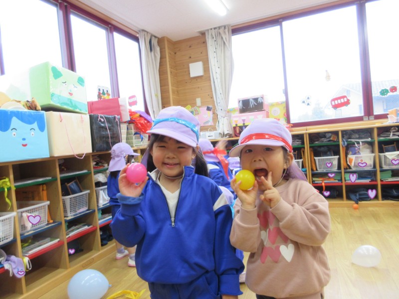 今日は、ぞう組とうさぎ組で運動会をしました。 赤、青、黄の3チームに分かれて、玉入れをしたり皆 「負けたくない!」と強気で、チームで協力して 頑張っていましたよ。 また、他のクラスとも交流しながらも楽しんでいこうと 思います。