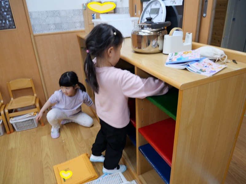 2025年最後の活動は、保育室の大掃除をしました。 ロッカーや床、壁を雑巾で拭いていきどんどん綺麗に なっていく保育室を見ながら、「ピカピカになってるー!」と 喜ぶ子ども達でした。 お道具箱やワーク等も持ち帰りしてますので、休み期間中に 中身の確認をお願い致します。