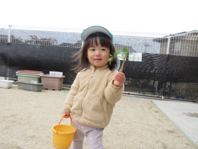 「ほら葉っぱだよ」「人参の色しているね」と興味津々の