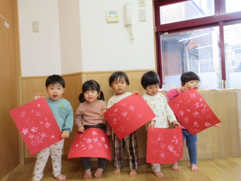 今日は、ひな祭り製作で桜の花びらをスタンプで押しました。
