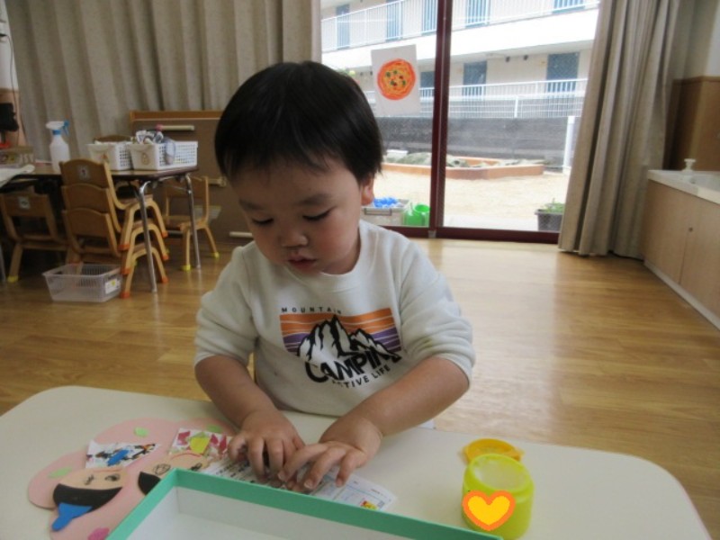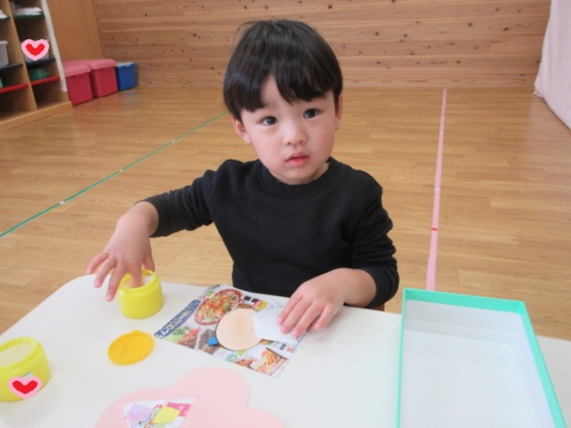 今日は、ひな祭り製作を行いました。 桃の花にお雛様、お内裏様を貼り、周りを小さいお花と 葉っぱで飾り付けをし、完成しました。 見本と比べてお雛様をどこに貼るか考えたり、少量の 糊を手に取り塗り広げたりと一生懸命に取り組む姿が 見られましたよ。 可愛い作品が沢山出来たので、楽しみにしていてくださいね。