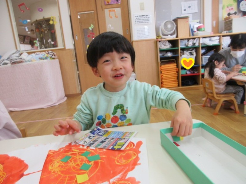 今日は、スパゲティ製作の具を1回切りで表現しました。 緑はピーマン、赤はベーコン黄は玉ねぎと子ども達と イメージし合いながら、1回切りをしました。 繰り返し行っていく上で、グーパーと手の動かし方も 上達しています。 また、切った野菜を糊で貼付け、トッピングをしました。 個性のある作品となりました。