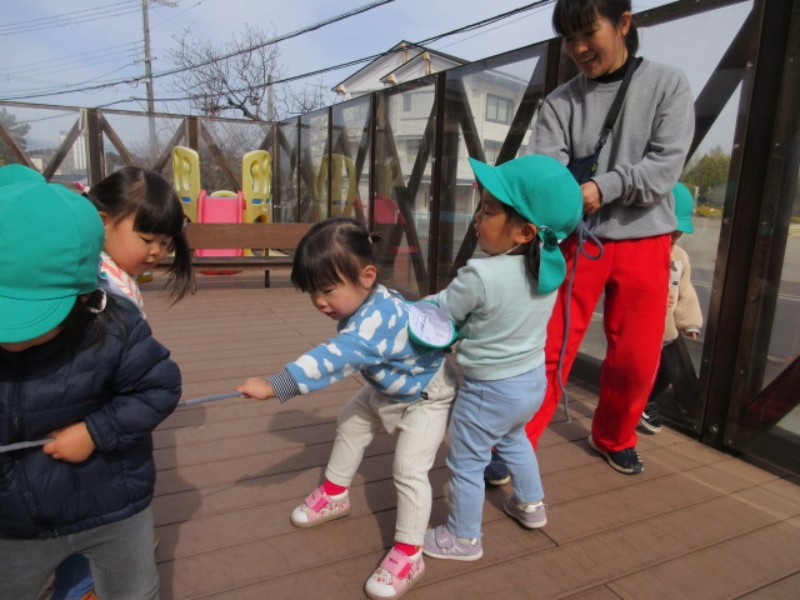 長縄を電車に見立てると、「乗りたーい」と皆で