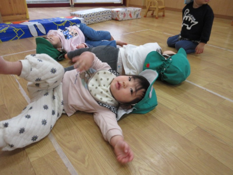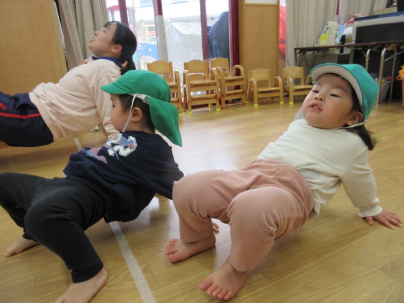 今日は、リトミックをしました。 リトミックの前に柔軟体操と準備体操をしっかりと 行った後、ピアノに合わせてジャンプをしたり、コロコロと 転がったり、汽車になってゆっくりと歩いてみたりと楽しく 身体を動かしました!!