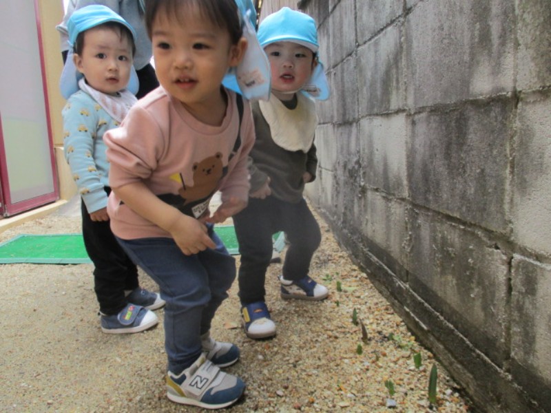 秋に皆で植えたチューリップの球根が土から芽を出しているのを見付けましたよ。
