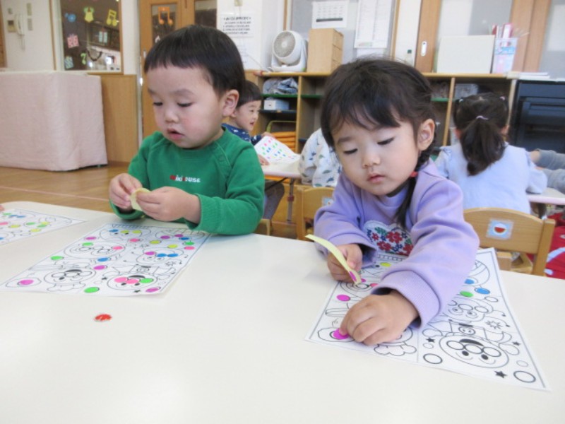 今日は、シール貼りをしました。 大、小様々な大きさのシールとイラストの描いた 台紙を用意し、好きなイ..