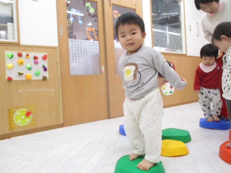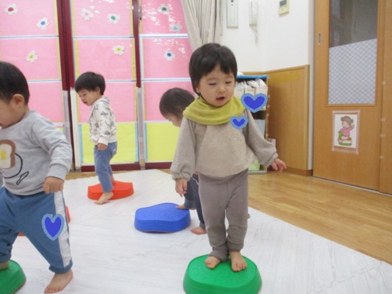 お部屋で運動遊びをしました。 床に並べたバランスストーンを見ると、上手に乗り 少し高い所から眺めを楽..