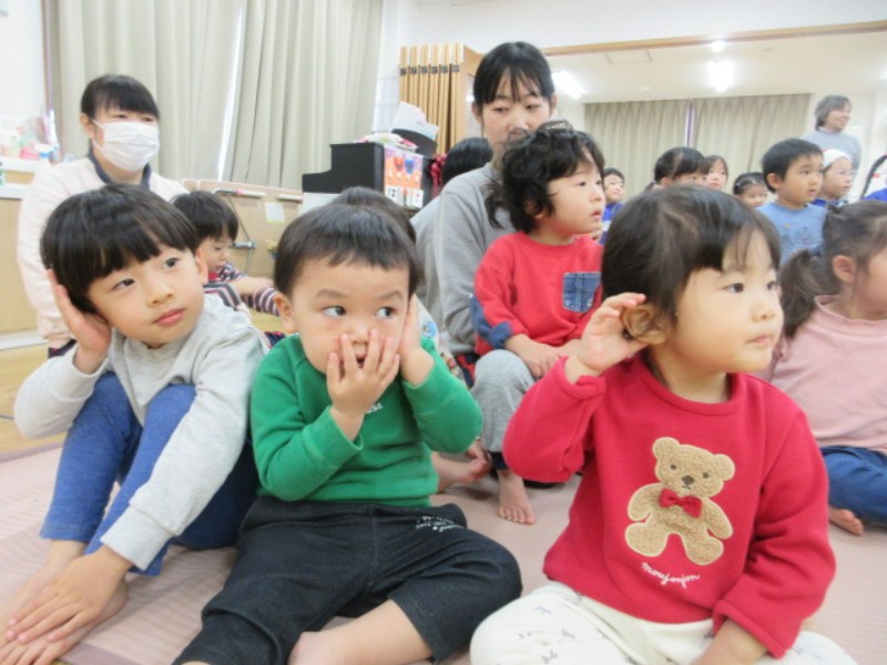 今日は、12月のお誕生日会とクリスマスに参加しました。 「あれ、何か鈴の音が聞こえるね」と保育者が声..