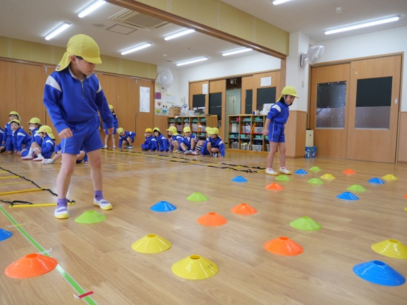 今日は、新しい運動遊びをしました。 バラバラになったコーンを色ごとに元の場所に配置していくと いう頭..