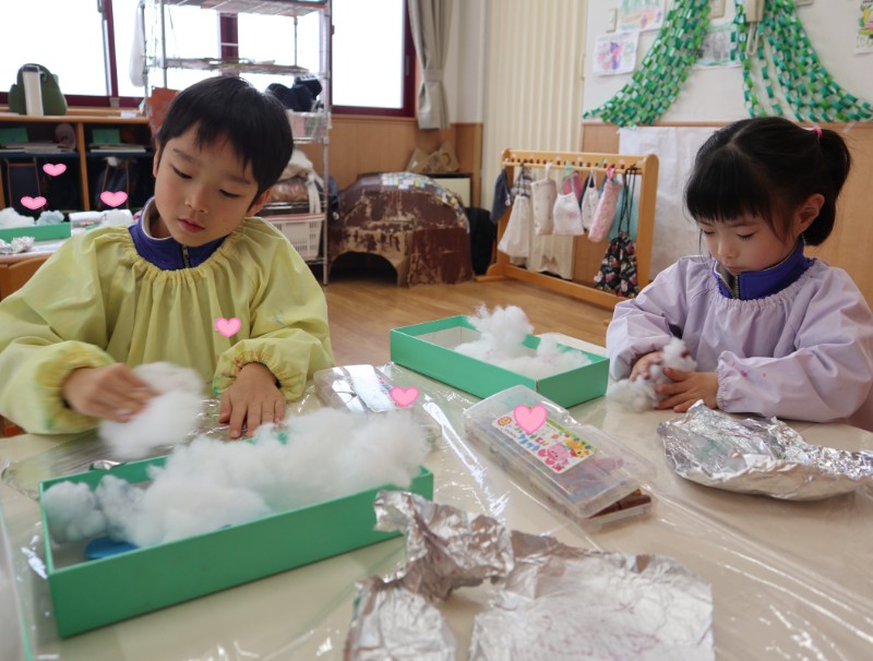 雪だるまの製作をしました。 アルミホイルにクレパスで色を付け、綿をこすりつけると 色が付いていく様子..