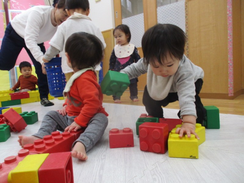 大型レゴブロックで遊びました。 集中して一人でそーっと積み上げたり、保育者と一緒に バスやお家を作っ..