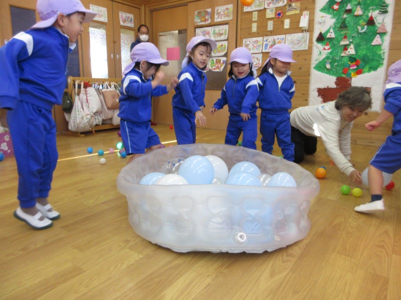 今日は、風船とボールを使ったゲームをしました。 ボールを力強く投げ、プールの中にある風船を外に出すの..