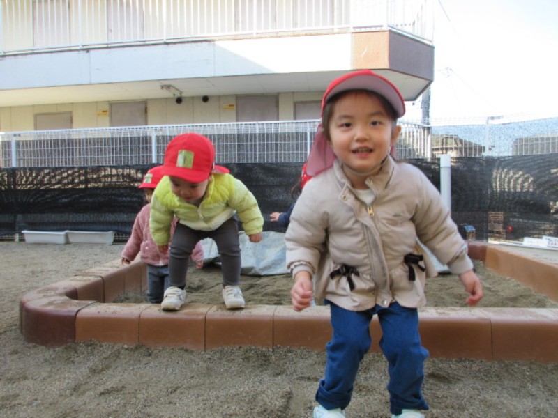 今日は園庭で遊びました。 砂場の枠を使用し、20cm程の高さから、園庭に 向かって両足ジャンプを行い..