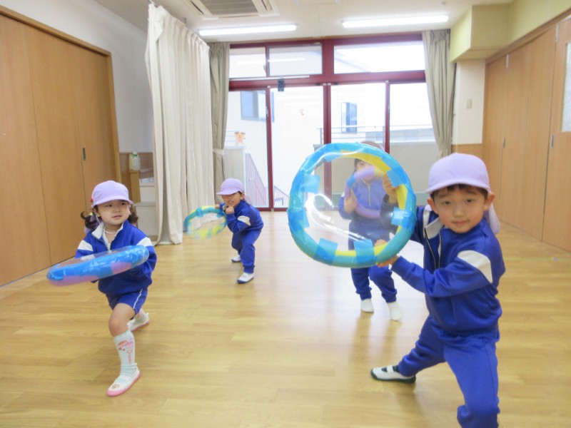 今日は、風船遊びをしました。 スポンジで作ったラケットで、5人チームを作り 風船を落とさない様にポン..