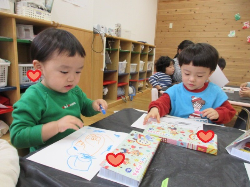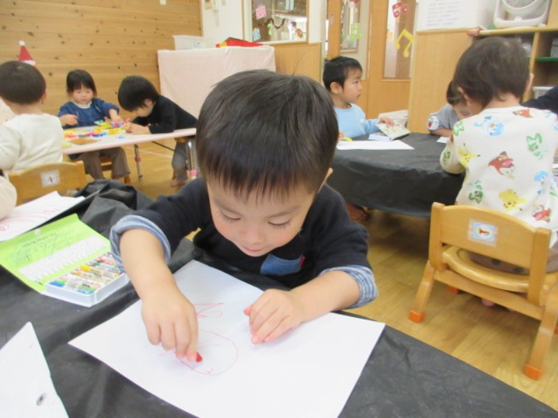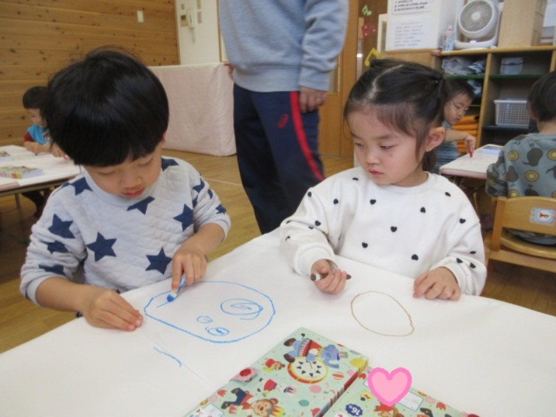 今日は、クレパスを使ってお絵描きをしました。 沢山の丸を描いたり、「アンパンマン」や「お化け」と 見..