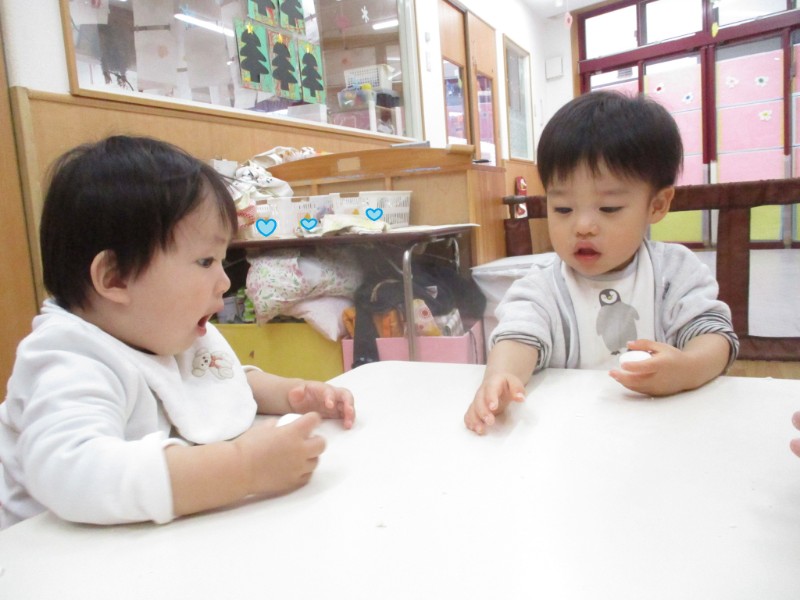 米粉粘土をして遊びました。 保育者から丸くした粘土を受け取ると、初めは慎重に そーっと触って感触を確..