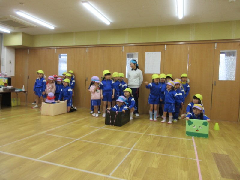 今日は、ぞう組とうさぎ組で運動会をしました。 赤、青、黄の3チームに分かれて、玉入れをしたり皆 「負..