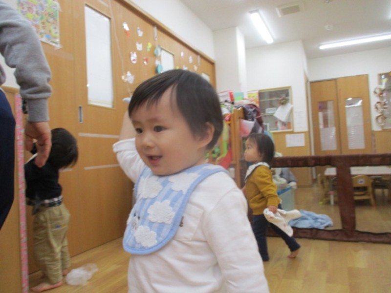 皆でお掃除ごっこをしました。 小さな雑巾を持つと保育者の動きを真似て 床や壁を拭く事を楽しでいる子ど..
