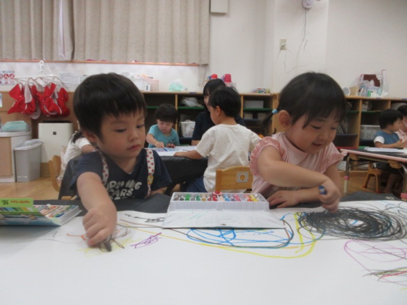 2025.09.29 あひる組今日は、好きな色の画用紙とマーカーやクレパス等の 様々なお絵描き道具を選び、画用紙一杯に絵を描きまし..