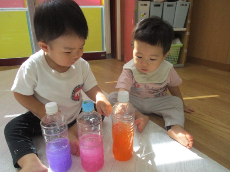 2025.09.18 ひよこ組ペットボトルに千切ったフラワー紙と水を入れ、振ってみると色水が出来、床の上で転がしたり、太陽の光に当..