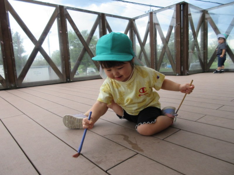 2025.09.18 あひる組久しぶりにテラスに出て遊びました。 筆と水を使ってお絵描きをしたり、ヘリコプターが近づいてくると、興..