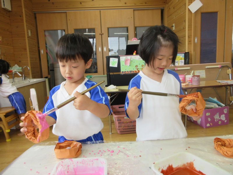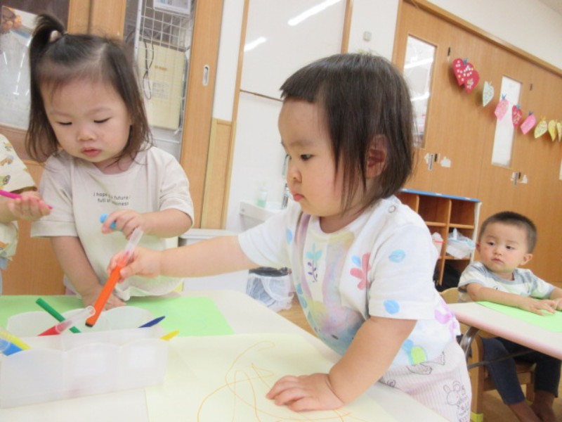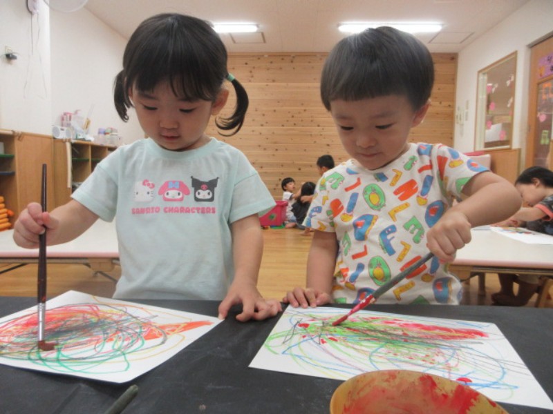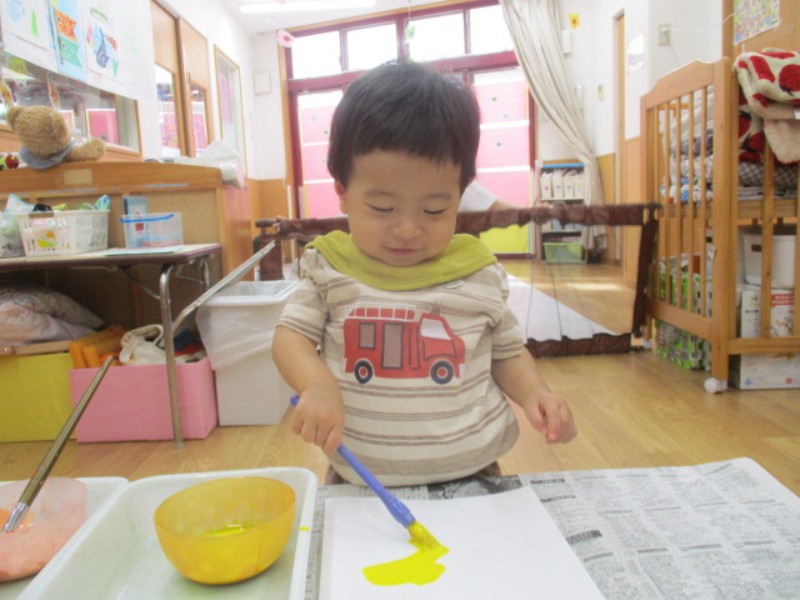 2025.09.26 ひよこ組今日は、絵具遊びをしました。 筆に絵具を付けると、保育者に見守られながら手を動かし、自分で描いてみよ..