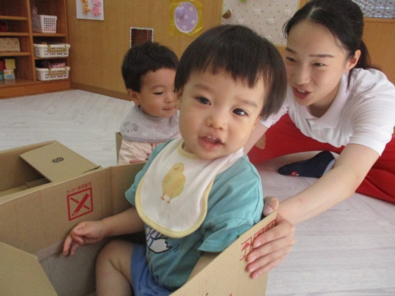 2025.09.19 ひよこ組今日は、段ボール箱で遊びました。 組み立てた箱の中に入ると、自分専用のスペースが出来て 嬉しそうに..
